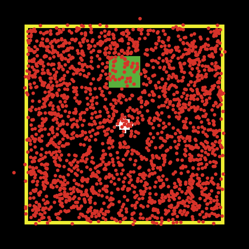 In this model, the red turtles represent heat, and the yellow border demarcates the room whose temperature is being regulated. The yellow border is semi-permeable, allowing some of the heat that hits it to escape from the room. This heat disappears from the model once it reaches the edge of the world. A thermometer, indicated by the green square, measures the approximate temperature of the room (effectively, the density of red turtles). The heater is located in the center of the room, represented by a white patch.