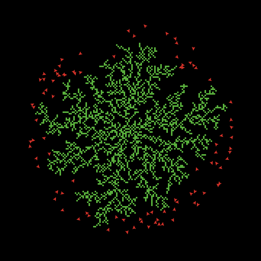In this model, the green squares are on a grid. For a different implementation of the same idea that does not involve a grid, see DLA Alternate. It uses circular particles that stick to each other.