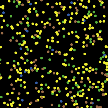 In the model, blue and yellow molecules can react with one another as can green and brown molecules. At each tick, each molecule move randomly throughout the world encountering other molecules. If it meets a molecule with which it can react (for example a yellow molecule meeting a blue, or a brown meeting a green, a reaction occurs. Because blue and yellow molecules react to produce green and brown molecules, and green and brown molecules react to produce blue and yellow molecules, eventually a state of equilibrium is reached.