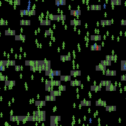 The presence of the virus in the population is represented by the colors of individuals. Three colors are used: green individuals are uninfected, blue individuals are infected but their infection is unknown, and red individuals are infected and their infection is known.