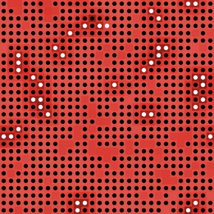 Each time step, every patch will calculate the temperature at that spot based on (1) the energy absorbed by the daisy at that patch and (2) the diffusion of 50% of the temperature value at that patch between its neighbors. Open ground patches that are adjacent to a daisy have a probability of sprouting a daisy that is the same color as the neighboring daisy, based on a parabolic probability function that depends on the local temperature (where an optimum temperature of 22.5 yields a maximum probability of 100% of sprouting a new daisy). Daisies age each step of the simulation until they reach a maximum age, at which point they die and the patch they were in becomes open.
