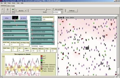 The majority-threshold sets the proportion of citizens that must agree that climate change is taking place before action is taken. Mean public wisdom sets the mean of a normal distribution for wisdom for citizens. Individuals with a wisdom value of 0.67 or more always defer to climate scientists. Individuals with wisdom value of -0.67 or less always defer to anti-scientists (the outcome is obvious, but is left in for completeness). Individuals with an in-beween value are equally persuaded by scientists and anti-scientists. Science-dissemination sets how mobile scientists are and hence, in effect, how well they are popularising the state of the climate. Anti-scientists take the contrary position to scientists. When anti-science dissemination is set high anti-scientists are effective in popularising their contrary position. If public wisdom is set high then the anti-science dissemination value does not apply. The default value for dissemination is set higher for anti-science than science to reflect the situation in the real world. In the context of global warming, Lord Christopher Monckton has one hundred times the presence on YouTube as John Houghton in the context of global warming. Monckton has been deacribed world’s leading global warming sceptic. However, his credentials are in journalism and classics and he has not even published one peer-reviewed scientific paper, let alone in climate science. Houghton is professor of atmospheric physics at Oxford University and co-chair of the Intergovernmental Panel on Climate Change's (IPCC) scientific assessment working group. The IPCC is a body of thousands of scientists comprehensively assessing the risk of climate change.