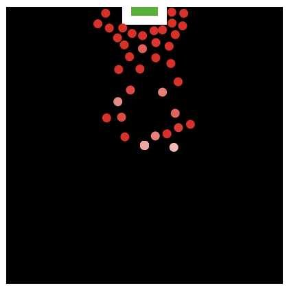 The model's core is based on D. Helbing and P. Molnar's social forces model. Each turtle has a force that tends towards the bartender (goal/green patches), a force that repels from the walls (white patches), and a force that repels from other turtles. The force from other turtles is reduced if they are not in the field of view.