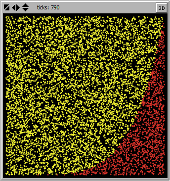 ;;;;;;;;;;;;;;;;;;;;;;;;;;; ;; variable declarations ;; ;;;;;;;;;;;;;;;;;;;;;;;;;;; globals [ value-integral approx-integral scale-factor ] ;;;;;;;;;;;;;;;;;;;;;; ;; setup procedures ;; ;;;;;;;;;;;;;;;;;;;;;; to setup clear-all set scale-factor 25 resize-world 0 scale-factor 0 scale-factor set-default-shape turtles "dot" reset-ticks if (function = "y = x^5") [ set value-integral 1 / 6 ] if (function = "y = (cos x)^2") [ set value-integral 0.7273243567 ] if (function = "y = (sin (1/x))^2") [ set value-integral 0.6734567683 ] end to-report scale [ x ] report (x / scale-factor) end to-report degree [ x ] report (x * 180 / pi) end to-report value-function [ x ] if (function = "y = x^5") [ report (scale x) * (scale x) * (scale x) * (scale x) * (scale x) ] if (function = "y = (cos x)^2") [ report (cos (degree (scale x))) * (cos (degree (scale x))) ] if (function = "y = (sin (1/x))^2") [ report (sin (degree (1 / (scale x)))) * (sin (degree (1 / (scale x)))) ] end ;;;;;;;;;;;;;;;;;;;;;;;; ;; runtime procedures ;; ;;;;;;;;;;;;;;;;;;;;;;;; to go create-turtles 10 [ set size 0.5 setxy random-float scale-factor random-float scale-factor set color yellow if (ycor < scale-factor * (value-function xcor)) [ set color red ] ] set approx-integral (count turtles with [color = red]) / (count turtles) tick end