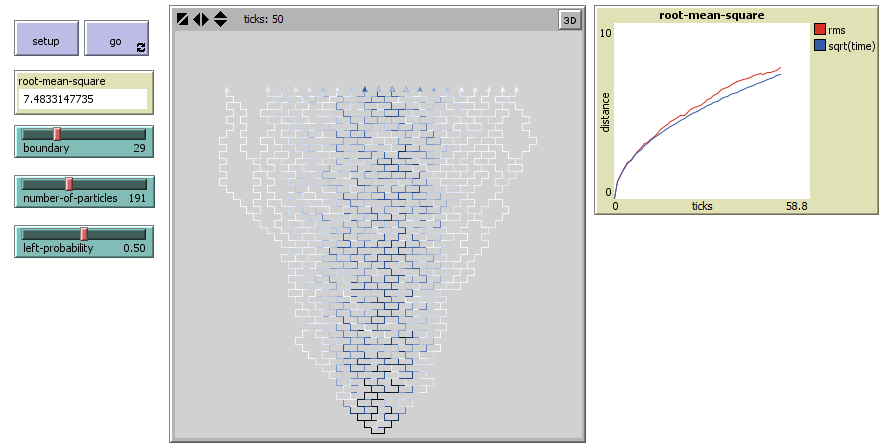 ;;;;;;;;;;;;;;;;;;;;;;;;;;; ;; variable declarations ;; ;;;;;;;;;;;;;;;;;;;;;;;;;;; globals [ sum-distance root-mean-square ] ;;;;;;;;;;;;;;;;;;;;;; ;; setup procedures ;; ;;;;;;;;;;;;;;;;;;;;;; ;; set up the patches and creates turtles to setup clear-all set-patch-size (200 / boundary) resize-world (- boundary) boundary 0 (boundary * 2) ask patches [ set pcolor gray + 3 ] setup-turtles reset-ticks end ;; determines the number of turtles and their color to setup-turtles ;; the origin is at the bottom of the view so there is no need ;; to relocate the turtles upon creation crt number-of-particles [ set color black ;; set pen-size 3 set heading 0 pd ] end ;;;;;;;;;;;;;;;;;;;;;;;; ;; runtime procedures ;; ;;;;;;;;;;;;;;;;;;;;;;;; to go if any? turtles with [ patch-at 0 1 = nobody ] [ ask turtles [ set ycor 0 ] clear-drawing ] ;; have the turtles randomly pick either right or left and ;; move in that direction ask turtles [ ifelse ((random-float 1) < left-probability ) [ ;; go left set heading 90 forward 1 set heading 0 forward 1 ] [ ;; go right set heading 270 forward 1 set heading 0 forward 1 ] ;; set the color of the turtles to give a rough idea of how many turtles ;; are at each location -- the lighter the color, the greater the number ;; of turtles set color scale-color blue (count turtles-here) (number-of-particles / 5) 0 ] ;; calculate root mean square of distance of all particles set sum-distance 0 foreach sort turtles [ ask ? [ set sum-distance (sum-distance + xcor * xcor) ] ] set root-mean-square (sqrt (sum-distance / (count turtles))) tick end