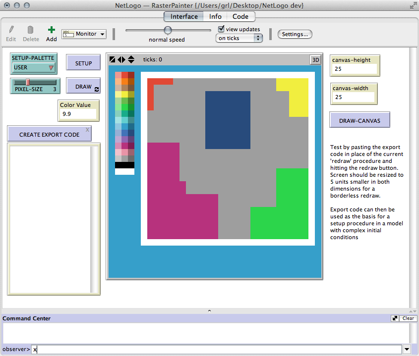 This "model" is a tool for creating a raster of patch colors that can be used as initial conditions in other NetLogo models
