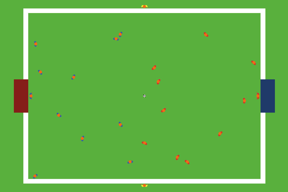 At the setup and after each goal the players are randomly placed on their side of the field leading to a different behaviour for every model run.