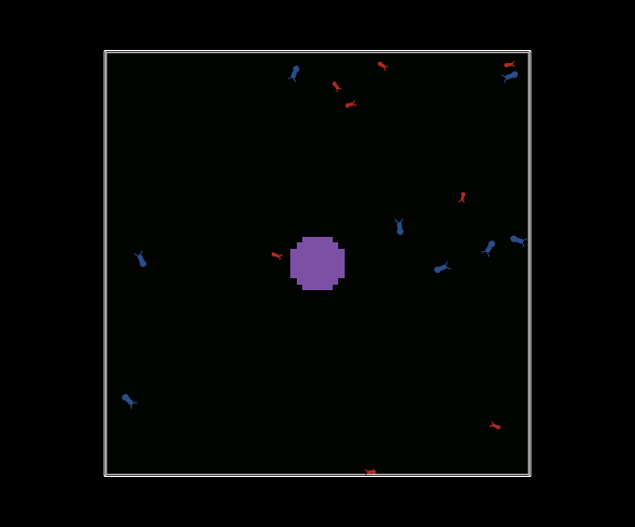breed [ants1 ant1] breed [ants2 ant2] turtles-own [age] patches-own [ chemical ;; amount of chemical on this patch food ;; amount of food on this patch (0, 1, or 2) nest? ;; true on nest patches, false elsewhere nest-scent ;; number that is higher closer to the nest food-source-number ;; number (1, 2, or 3) to identify the food sources ] ;;;;;;;;;;;;;;;;;;;;;;;; ;;; Setup procedures ;;; ;;;;;;;;;;;;;;;;;;;;;;;; to setup clear-all set-default-shape ants1 "bug" create-ants1 population [ set size 2 set age 1 ;; easier to see set color red ] ;; red = not carrying food set-default-shape ants2 "bug" create-ants2 population [ set size 3 set age 1 ;; easier to see set color blue ] ;; red = not carrying food setup-patches reset-ticks end to setup-patches ask patches [ setup-nest2 setup-food recolor-patch ] end to setup-nest2 ;; patch procedure ;; set nest? variable to true inside the nest, false elsewhere set nest? (distancexy 0 0) < 5 ;; spread a nest-scent over the whole world -- stronger near the nest set nest-scent 200 - distancexy 0 0 end to setup-food ;; patch procedure ;; setup food source one on the right if (distancexy (0.6 * max-pxcor) 0) < 5 [ set food-source-number 1 ] ;; setup food source two on the lower-left if (distancexy (-0.6 * max-pxcor) (-0.6 * max-pycor)) < 5 [ set food-source-number 2 ] ;; setup food source three on the upper-left if (distancexy (-0.8 * max-pxcor) (0.8 * max-pycor)) < 5 [ set food-source-number 3 ] ;; set "food" at sources to either 1 or 2, randomly if food-source-number > 0 [ set food one-of [1 2] ] end to recolor-patch ;; patch procedure ;; give color to nest and food sources ifelse nest? [ set pcolor violet ] [ ifelse food > 0 [ if food-source-number = 1 [ set pcolor cyan ] if food-source-number = 2 [ set pcolor sky ] if food-source-number = 3 [ set pcolor blue ] ] ;; scale color to show chemical concentration [ set pcolor scale-color green chemical 0.1 5 ] ] end ;;;;;;;;;;;;;;;;;;;;; ;;; Go procedures ;;; ;;;;;;;;;;;;;;;;;;;;; to go ;; forever button ask ants1 [ ifelse color = red [ look-for-food ] ;; not carrying food? look for it [ return-to-nest ] ;; carrying food? take it back to nest wiggle fd 1 ] ask ants2 [ ifelse color = blue [ look-for-food2 ] ;; not carrying food? look for it [ return-to-nest2 ] ;; carrying food? take it back to nest wiggle fd 1 ] diffuse chemical (diffusion-rate / 100) ask patches [ set chemical chemical * (100 - evaporation-rate) / 100 ;; slowly evaporate chemical recolor-patch ] tick end to return-to-nest ;; ants1 procedure ;; set age (age + 1) ifelse nest? [ ;; drop food and head out again set color red rt 180 ] [ set chemical chemical + 60 ;; drop some chemical uphill-nest-scent ] ;; head toward the greatest value of nest-scent if random 100 < 10 [ rt 180 fd 1 rt 1 ] end to return-to-nest2 ;; ants2 procedure ;; set age (age + 1) ifelse nest? [ ;; drop food and head out again set color blue rt 180 ] [ set chemical chemical + 60;; drop some chemical uphill-nest-scent ] ;; head toward the greatest value of nest-scent end to look-for-food ;; ants1 procedure death1 if food > 0 [ set color red + 1 ;; pick up food set food food - 1 ;; and reduce the food source rt 180 ;; and turn around stop ] ;; go in the direction where the chemical smell is strongest if (chemical >= 0.05) and (chemical < 2) [ uphill-chemical ] end to look-for-food2 ;; ants2 procedure death2 if food > 0 [ set color blue + 1 ;; pick up food set food food - 1 ;; and reduce the food source rt 180 ;; and turn around stop ] ;; go in the direction where the chemical smell is strongest if (chemical >= 0.05) and (chemical < 2) [ uphill-chemical ] end ;; sniff left and right, and go where the strongest smell is to uphill-chemical ;; ants1 procedure let scent-ahead chemical-scent-at-angle 0 let scent-right chemical-scent-at-angle 45 let scent-left chemical-scent-at-angle -45 if (scent-right > scent-ahead) or (scent-left > scent-ahead) [ ifelse scent-right > scent-left [ rt 45 ] [ lt 45 ] ] end ;; sniff left and right, and go where the strongest smell is to uphill-nest-scent ;; ants1 procedure let scent-ahead nest-scent-at-angle 0 let scent-right nest-scent-at-angle 45 let scent-left nest-scent-at-angle -45 if (scent-right > scent-ahead) or (scent-left > scent-ahead) [ ifelse scent-right > scent-left [ rt 45 ] [ lt 45 ] ] end to wiggle ;; ants1 procedure rt random 40 lt random 40 if not can-move? 1 [ rt 180 ] end to death1 ;; turtle procedure ;; when energy dips below zero, die if age > 5 [ die ] end to death2 ;; turtle procedure ;; when energy dips below zero, die if age > 8 [ die ] end to-report nest-scent-at-angle [angle] let p patch-right-and-ahead angle 1 if p = nobody [ report 0 ] report [nest-scent] of p end to-report chemical-scent-at-angle [angle] let p patch-right-and-ahead angle 1 if p = nobody [ report 0 ] report [chemical] of p end ; Copyright 1997 Uri Wilensky. ; See Info tab for full copyright and license.