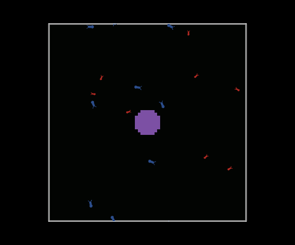 breed [ants1 ant1] breed [ants2 ant2] turtles-own [age] patches-own [ chemical ;; amount of chemical on this patch food ;; amount of food on this patch (0, 1, or 2) nest? ;; true on nest patches, false elsewhere nest-scent ;; number that is higher closer to the nest food-source-number ;; number (1, 2, or 3) to identify the food sources ] ;;;;;;;;;;;;;;;;;;;;;;;; ;;; Setup procedures ;;; ;;;;;;;;;;;;;;;;;;;;;;;; to setup clear-all set-default-shape ants1 "bug" create-ants1 population [ set size 2 set age 1 ;; easier to see set color red ] ;; red = not carrying food set-default-shape ants2 "bug" create-ants2 population [ set size 3 set age 1 ;; easier to see set color blue ] ;; red = not carrying food setup-patches reset-ticks end to setup-patches ask patches [ setup-nest2 setup-food recolor-patch ] end to setup-nest2 ;; patch procedure ;; set nest? variable to true inside the nest, false elsewhere set nest? (distancexy 0 0) < 5 ;; spread a nest-scent over the whole world -- stronger near the nest set nest-scent 200 - distancexy 0 0 end to setup-food ;; patch procedure ;; setup food source one on the right if (distancexy (0.6 * max-pxcor) 0) < 5 [ set food-source-number 1 ] ;; setup food source two on the lower-left if (distancexy (-0.6 * max-pxcor) (-0.6 * max-pycor)) < 5 [ set food-source-number 2 ] ;; setup food source three on the upper-left if (distancexy (-0.8 * max-pxcor) (0.8 * max-pycor)) < 5 [ set food-source-number 3 ] ;; set "food" at sources to either 1 or 2, randomly if food-source-number > 0 [ set food one-of [1 2] ] end to recolor-patch ;; patch procedure ;; give color to nest and food sources ifelse nest? [ set pcolor violet ] [ ifelse food > 0 [ if food-source-number = 1 [ set pcolor cyan ] if food-source-number = 2 [ set pcolor sky ] if food-source-number = 3 [ set pcolor blue ] ] ;; scale color to show chemical concentration [ set pcolor scale-color green chemical 0.1 5 ] ] end ;;;;;;;;;;;;;;;;;;;;; ;;; Go procedures ;;; ;;;;;;;;;;;;;;;;;;;;; to go ;; forever button ask ants1 [ ifelse color = red [ look-for-food ] ;; not carrying food? look for it [ return-to-nest ] ;; carrying food? take it back to nest wiggle fd 1 ] ask ants2 [ ifelse color = blue [ look-for-food2 ] ;; not carrying food? look for it [ return-to-nest2 ] ;; carrying food? take it back to nest wiggle fd 1 ] diffuse chemical (diffusion-rate / 100) ask patches [ set chemical chemical * (100 - evaporation-rate) / 100 ;; slowly evaporate chemical recolor-patch ] tick end to return-to-nest ;; ants1 procedure ;; set age (age + 1) ifelse nest? [ ;; drop food and head out again set color red rt 180 ] [ set chemical chemical + 60 ;; drop some chemical uphill-nest-scent ] ;; head toward the greatest value of nest-scent if random 100 < 10 [ rt 180 fd 1 rt 1 ] end to return-to-nest2 ;; ants2 procedure ;; set age (age + 1) ifelse nest? [ ;; drop food and head out again set color blue rt 180 ] [ set chemical chemical + 60;; drop some chemical uphill-nest-scent ] ;; head toward the greatest value of nest-scent end to look-for-food ;; ants1 procedure death1 if food > 0 [ set color red + 1 ;; pick up food set food food - 1 ;; and reduce the food source rt 180 ;; and turn around stop ] ;; go in the direction where the chemical smell is strongest if (chemical >= 0.05) and (chemical < 2) [ uphill-chemical ] end to look-for-food2 ;; ants2 procedure death2 if food > 0 [ set color blue + 1 ;; pick up food set food food - 1 ;; and reduce the food source rt 180 ;; and turn around stop ] ;; go in the direction where the chemical smell is strongest if (chemical >= 0.05) and (chemical < 2) [ uphill-chemical ] end ;; sniff left and right, and go where the strongest smell is to uphill-chemical ;; ants1 procedure let scent-ahead chemical-scent-at-angle 0 let scent-right chemical-scent-at-angle 45 let scent-left chemical-scent-at-angle -45 if (scent-right > scent-ahead) or (scent-left > scent-ahead) [ ifelse scent-right > scent-left [ rt 45 ] [ lt 45 ] ] end ;; sniff left and right, and go where the strongest smell is to uphill-nest-scent ;; ants1 procedure let scent-ahead nest-scent-at-angle 0 let scent-right nest-scent-at-angle 45 let scent-left nest-scent-at-angle -45 if (scent-right > scent-ahead) or (scent-left > scent-ahead) [ ifelse scent-right > scent-left [ rt 45 ] [ lt 45 ] ] end to wiggle ;; ants1 procedure rt random 40 lt random 40 if not can-move? 1 [ rt 180 ] end to death1 ;; turtle procedure ;; when energy dips below zero, die if age > 5 [ die ] end to death2 ;; turtle procedure ;; when energy dips below zero, die if age > 8 [ die ] end to-report nest-scent-at-angle [angle] let p patch-right-and-ahead angle 1 if p = nobody [ report 0 ] report [nest-scent] of p end to-report chemical-scent-at-angle [angle] let p patch-right-and-ahead angle 1 if p = nobody [ report 0 ] report [chemical] of p end ; Copyright 1997 Uri Wilensky. ; See Info tab for full copyright and license.