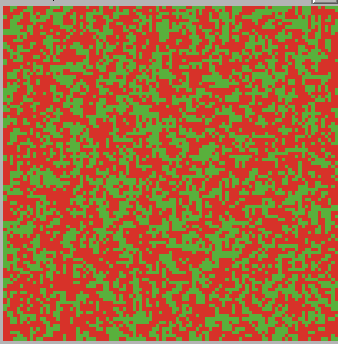 The last item of the interface we need to discuss (and, perhaps, the most immediate to attention) is the Netlogo's world, the patches represent the agents, and their colour is set green if their sentiment is good (bullish) and red if their sentiment is bad (bearish). The world also plays an important role in the main findings.