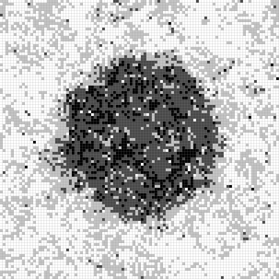 Turn off "rnd-initial" so that the simulation starts with a well defined boundary in the form of a circle. Notice that for uniform influence, you only need a little bit of amplification (e.g., 0.05) to keep the form of the circle. Also notice that the circle slowly decreases in size.