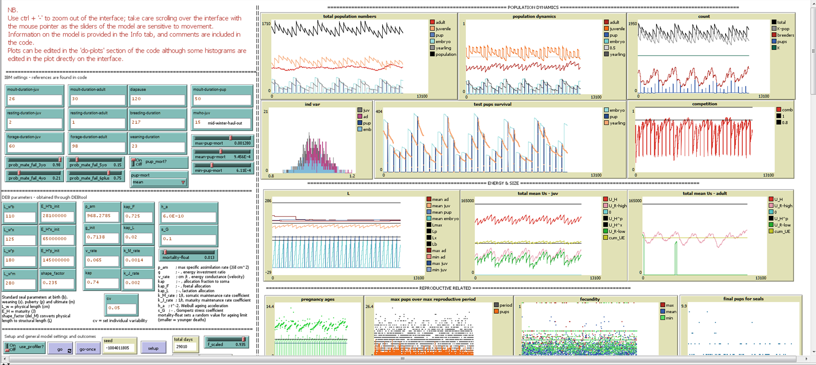 Once NetLogo has been opened, three tabs can be seen; Interface, Info and Code. The main tab used for running of the models, is the Interface. Here all global parameters are set, and outcomes visualised. The Info tab can include information on the model, its use, or important notes. The Code tab contains the procedures implemented in the model (detailed explanations of these procedures can be found in the ODD description of the model). Using the DEB-IBM can be done at two levels. Minimal modelling experience is required for the first level of interaction, which is through the interface only. A deeper understanding of modelling and the programming language are required when alterations are made to the code as well as the interface. This may be required, for example, when the model is to be adjusted to fit different species, or when the model (currently non-spatial) is enhanced to become spatially explicit.
