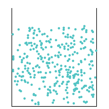 globals [ tick-delta ;; how much we advance the tick counter this time through max-tick-delta ;; the largest tick-delta is allowed to be drop-counter limit mouse-up? bored so-so excited something-cool found-error experiments left-temperature right-temperature temperature ] breed [ erasers eraser ] breed [ walls wall ] breed [ particles particle ] particles-own [ speed mass energy ;; particle info last-collision first-time ] walls-own [ energy valve-1? valve-2? pressure? surface-energy ] to setup ;; clear all ca set limit 50 create-erasers 1 [set hidden? true set size 3 set color white] ;; import the bitmap ask patches [set pcolor white] ;;import-pcolors "becker.png" draw-beaker ask patches with [pycor < 70 and pycor > -80 and pxcor > 20 and pxcor < 59][set pcolor white] ;; set-default-shape particles "circle" ;; initialize drop counter set drop-counter 10000 ;; set max-tick-delta 0.1073 ;; make-particles-within-box set experiments "add ink" reset-ticks set left-temperature mean [speed] of particles with [xcor < 0] set right-temperature mean [speed] of particles with [xcor > 0] set temperature mean [speed] of particles end ;; creates initial particles to make-particles-within-box create-particles 500 [ setup-particle random-position ] calculate-tick-delta end to calculate-tick-delta ;; tick-delta is calculated in such way that even the fastest ;; particle will jump at most 1 patch length in a tick. As ;; particles jump (speed * tick-delta) at every tick, making ;; tick length the inverse of the speed of the fastest particle ;; (1/max speed) assures that. Having each particle advance at most ;; one patch-length is necessary for it not to "jump over" a wall ;; or another particle. ifelse any? particles with [speed > 0] [ set tick-delta min list (1 / (ceiling max [speed] of particles)) max-tick-delta ] [ set tick-delta max-tick-delta ] end to setup-particle ;; particle procedure set speed temperatura-inicial set mass 3 set energy (.5 * mass * speed * speed) set color cyan set size 4 set first-time 1 ; was 0 set last-collision nobody end ;; place particle at random location inside the box. to random-position ;; particle procedure setxy (-72 + random-float (142)) -77 + random-float (120) set heading random-float 360 end to draw-beaker ask patches with [pxcor = -74 and (pycor >= -90 and pycor <= 80)] [set pcolor 0] ask patches with [pxcor = 73 and (pycor >= -90 and pycor <= 80)] [set pcolor 0] ask patches with [pycor = -90 and (pxcor >= -74 and pxcor <= 73)] [set pcolor 0] end ;; step the model to go mouseme ifelse mouse-up? != false [ if mouse-down? and drop-counter > 0 and experiments = "add ink" and mouse-ycor < 70 and mouse-xcor > -60 and mouse-xcor < 40[ set mouse-up? false drop-ink set drop-counter drop-counter - 1 ] if mouse-down? and experiments = "draw wall" [ ask patch round mouse-xcor round mouse-ycor [ set pcolor grey ask neighbors [set pcolor grey ask neighbors [set pcolor grey]] ] ] if mouse-down? and experiments = "heat up water" [ set mouse-up? false drop-hot-water ] if mouse-down? and experiments = "cool down water" [ set mouse-up? false drop-cold-water ] ] [ if not mouse-down? [ set mouse-up? true ] ] ask particles [ bounce ] ask particles [ move ] ask particles [ check-for-collision ] set left-temperature mean [speed] of particles with [xcor < 0] set right-temperature mean [speed] of particles with [xcor > 0] set temperature mean [speed] of particles tick-advance tick-delta calculate-tick-delta display end to bounce ;; particle procedure ;; get the coordinates of the patch we will be on if we go forward 1 if [pcolor ] of patch-here != white [die ask one-of particles with [color = cyan][hatch 1 [setup-particle] ]] let new-patch patch-ahead 1 let new-px [pxcor] of new-patch let new-py [pycor] of new-patch ifelse [pcolor] of new-patch = white and new-py < limit [ ;; if we're not about to hit a wall, we don't need to do any further checks stop ] [ ;; a drop has to fall if (color = blue and ycor >= limit)[stop] ;; if hitting the top or bottom, reflect heading around y axis if (ycor < new-py - 1 or ycor > new-py - 1) [ set heading (180 - heading) ;if first-time = 0 [set first-time 1] set speed speed ; if color = blue and first-time <= 5 [ ; set speed 0.0001 ; set first-time first-time + 1 ; ] ] ;; if hitting the left or right, reflect heading around x axis if (xcor <= new-px - 1 or xcor >= new-px - 1) [ set heading (360 - heading) ] ] end to factor-gravity ;; turtle procedure let gravity 0 ifelse color = cyan [set gravity 0.01 ][set gravity .01 ] let vx (dx * speed) let vy (dy * speed) - (gravity * tick-delta) ;; fixed gravity now is 3.5 was set speed sqrt ((vy ^ 2) + (vx ^ 2)) set heading atan vx vy end to move ;; particle procedure ;; In other GasLab models, we use "jump speed * tick-delta" to move the ;; turtle the right distance along its current heading. In this ;; model, though, the particles are affected by gravity as well, so we ;; need to offset the turtle vertically by an additional amount. The ;; easiest way to do this is to use "setxy" instead of "jump". ;; Trigonometry tells us that "jump speed * tick-delta" is equivalent to: ;; setxy (xcor + dx * speed * tick-delta) ;; (ycor + dy * speed * tick-delta) ;; so to take gravity into account we just need to alter ycor ;; by an additional amount given by the classical physics equation: ;; y(t) = 0.5*a*t^2 + v*t + y(t-1) ;; but taking tick-delta into account, since tick-delta is a multiplier of t. let xcorr (xcor + dx * speed * tick-delta) if xcorr <= -117 or xcorr >= 116 [set xcorr xcor] let gravity 0 ifelse color = cyan [set gravity 0.01 ][set gravity .01 ] ;; let ycorr (ycor + dy * speed * tick-delta - gravity * (0.5 * tick-delta * tick-delta)) ifelse color = cyan [ ] [ ;if ycorr >= limit [set ycorr ycor - 1] ] if ycorr > 75 [die] setxy xcorr ycorr factor-gravity end to drop-ink ;Turtle procedure for releasing a drop onto the pond ask patch round mouse-xcor round mouse-ycor [ sprout-particles 30 [ set heading -180 setxy ro