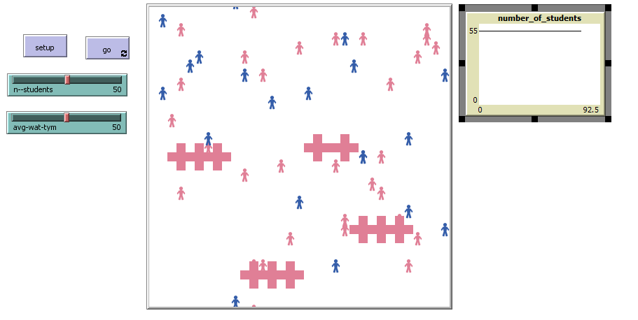 globals [ student_patches counter_patches table_patches1 table_patches2 table_patches3 table_patches4 table_patches5 tablem-x tablem-y tablef-x tablef-y female male ] breed [persons person] breed [waiters waiter] persons-own[ time_to_leave] to setup clear-all setup-tabels make-student reset-ticks end to make-student create-persons n--students [ choose-sex ;; become a man or a woman set size 1.5 setxy 16 0.5 set shape "person" set time_to_leave random 2 ] end to choose-sex ;; turtle procedure set color one-of [pink blue] end to go ask persons[ lt random 30 rt random 30 fd 0.1 setxy random-pxcor random-pycor ask persons with [color = blue and xcor >= tablem-x + 5 and ycor >= tablem-y + 5] [ stop fd 0] ask persons with [color = pink and xcor >= tablef-x + 5 and ycor >= tablef-y + 5 ] [ stop fd 0] ] tick end to setup-tables ask patch -13 66 [ set pcolor yellow ] end to setup-tabels ask patches [ set pcolor white ] set table_patches1 patches with [ pxcor = 11 and pycor = -8 ] ask table_patches1 [ set pcolor pink ask neighbors4 [ set pcolor pink ] ] set table_patches4 patches with [ pxcor = -1 and pycor = -13] ask table_patches4 [ set pcolor pink ask neighbors4 [ set pcolor pink ] ] set table_patches4 patches with [ pxcor = 7 and pycor = -8 ] ask table_patches4 [ set pcolor pink ask neighbors4 [ set pcolor pink ] ] set table_patches4 patches with [ pxcor = 9 and pycor = -8 ] ask table_patches4 [ set pcolor pink ask neighbors4 [ set pcolor pink ] ] set table_patches4 patches with [ pxcor = -5 and pycor = -13] ask table_patches4 [ set pcolor pink ask neighbors4 [ set pcolor pink ] ] set table_patches4 patches with [ pxcor = -5 and pycor = -13] ask table_patches4 [ set pcolor pink ask neighbors4 [ set pcolor pink ] ] set table_patches4 patches with [ pxcor = -3 and pycor = -13] ask table_patches4 [ set pcolor pink ask neighbors4 [ set pcolor pink ] ] set table_patches4 patches with [ pxcor = -13 and pycor = 0] ask table_patches4 [ set pcolor pink ask neighbors4 [ set pcolor pink ] ] set table_patches4 patches with [ pxcor = -11 and pycor = -0] ask table_patches4 [ set pcolor pink ask neighbors4 [ set pcolor pink ] ] set table_patches4 patches with [ pxcor = -9 and pycor = 0] ask table_patches4 [ set pcolor pink ask neighbors4 [ set pcolor pink ] ] set table_patches4 patches with [ pxcor = 2 and pycor = 1] ask table_patches4 [ set pcolor pink ask neighbors4 [ set pcolor pink ] ] set table_patches4 patches with [ pxcor = 5 and pycor = 1] ask table_patches4 [ set pcolor pink ask neighbors4 [ set pcolor pink ] ] set table_patches4 patches with [ pxcor = -9 and pycor = 0] ask table_patches4 [ set pcolor pink ask neighbors4 [ set pcolor pink ] ] end