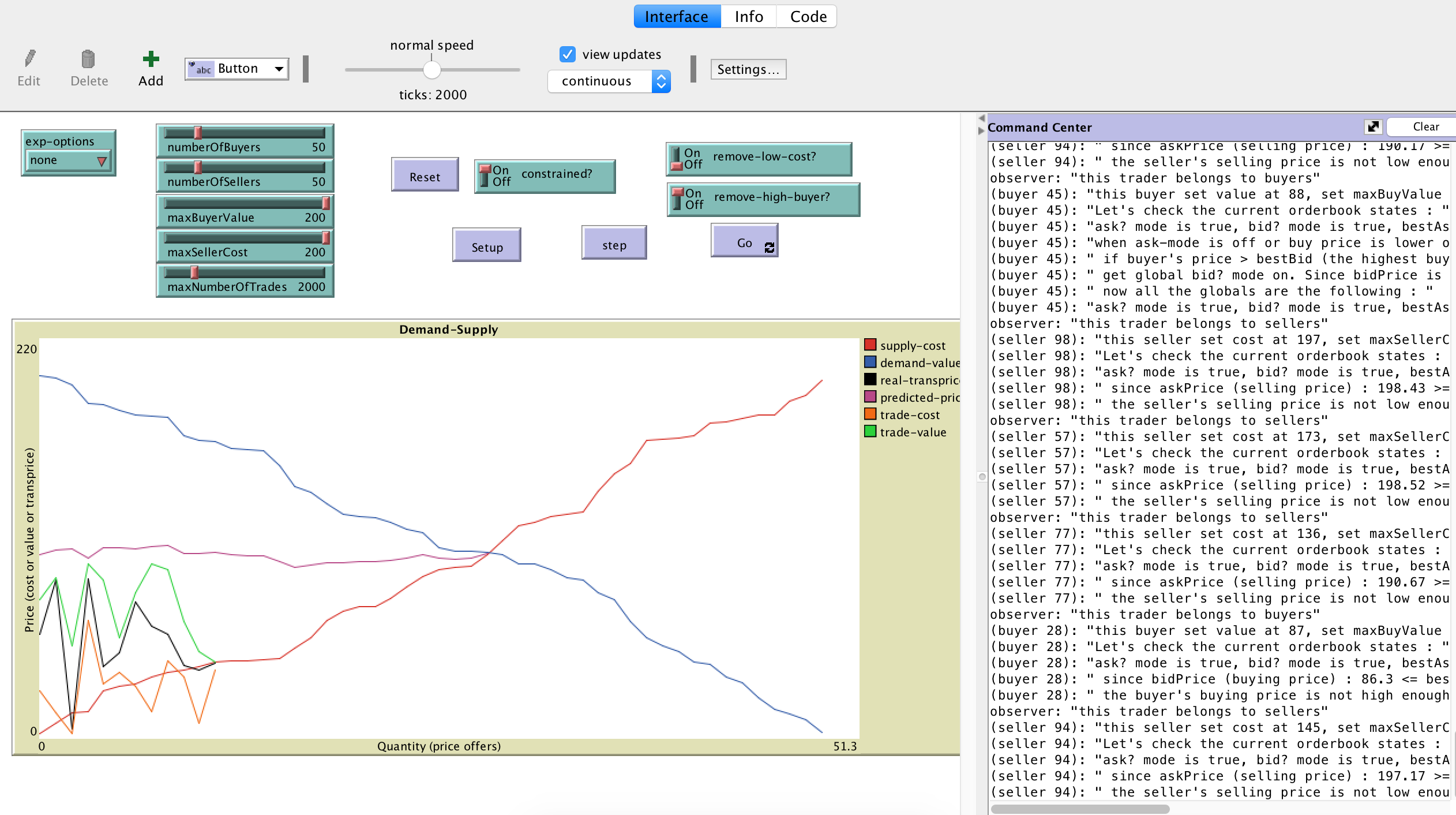 Start with an equal number of buyers and sellers and equal values for the maximum buyer value and seller cost. Run the model several times to get a sense of average price and quantity. Next double the number of sellers, make several runs, and see what happens to average price and quantity. Finally half the number of sellers from the original number; again make several runs and note what is happening to average price and quantity. Repeat the excerise holding the number of sellers at the original value, but double and half the number of buyers. How well did the model following the predictions of supply and demand theory.