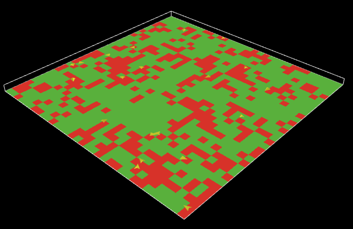 turtles-own [ energy ] to setup clear-all setup-patches setup-red reset-ticks end to go if ticks >= 12 [ setup-blue] if ticks >= 500 [ stop ] move-turtles eat-grass check-death reproduce tick end to move-turtles ask turtles [ right random 360 forward random 3 set energy energy - 5 ] end to setup-patches ask patches [ set pcolor green] end to setup-red create-turtles random 200 [setxy random-xcor random-ycor ] ask turtles [ set color yellow ] end to setup-blue create-turtles random 20 [setxy random-xcor random-ycor ] ask turtles [ set color blue if pcolor = red[ set energy energy + 5] ] end to eat-grass ask turtles [ if pcolor = green [ set pcolor red set energy energy + 10 ] if pcolor = red [ set energy energy - 2 ] ] end to check-death ask turtles [ if energy <= 0 [ die ] ] end to reproduce ask turtles [ if energy > 50 [ set energy energy - 50 hatch 1 [ set energy 50 ] ] ] end