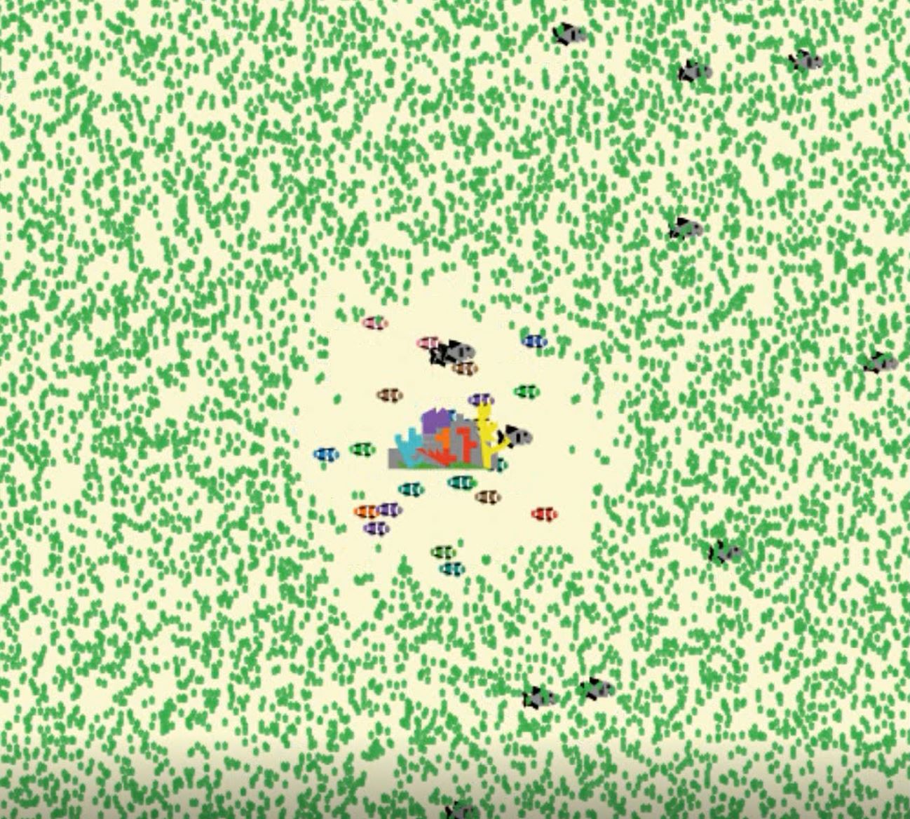 This project explores a simple underwater ecosystem made up of fish, a reef, predators, and seagrass. The fish begin and spend a lot of their time inside of reefs, that offer them protection from predators.