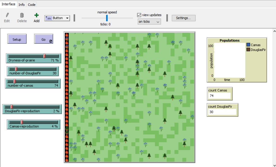 In the model, there are different breeds of turtles: camas, Douglas fir, fire, and embers. There are sliders for the number of camas and Douglas fir that the model begins with at setup as well as for the dryness of the prairie and the reproduction rate of Douglas fir trees and camas plants.