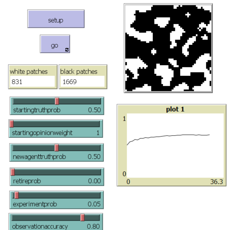patches-own [ vote ;; my vote (0 or 1) observation ;; last observation of nature likelihood ;; assessment of the likelihood of a proposition being true ] to setup clear-all resize-world -24 25 -24 25 ask patches [ generateinitialagent ] reset-ticks end to go ask patches [ if random-float 1 < retireprob [ generateagent ] ifelse random-float 1 < experimentprob [ conductexperiment ] [ learnfromneighbor ] ifelse likelihood > 0 [ set vote 1 ] [ set vote -1 ] recolor-patch ] if ticks = 1000 [ stop ] tick end to conductexperiment ifelse random-float 1 < observationaccuracy [ set observation 1 ] [ set observation ( -1 ) ] set likelihood ( likelihood + observation ) end to learnfromneighbor ifelse random-float 1 < openscienceprob [ set likelihood ( likelihood + ( [observation] of one-of neighbors ) ) ] [ set likelihood ( likelihood + ( [vote] of one-of neighbors ) ) ] end to generateinitialagent ; set likelihood ( 0 - random-float 100 ) set likelihood ( ( startingtruthprob - ( random-float 1 ) ) * startingopinionweight ) ifelse likelihood > 0 [ set vote 1 ] [ set vote -1 ] recolor-patch end to generateagent ; set likelihood ( 0 - random-float 100 ) set likelihood ( newagenttruthprob - ( random-float 1 ) ) ifelse likelihood > 0 [ set vote 1 ] [ set vote -1 ] recolor-patch end to recolor-patch ;; patch procedure ifelse vote = 1 [ set pcolor black ] [ set pcolor white ] end to writetofile ask patches [ file-write likelihood file-print "," ] end ; Law, D. (2017). CODA model of open inputs science. ; Model derived from: ; Martins, A. C. R. (2008). ; Continuous opinions and discrete actions in opinion dynamics problems. ; International Journal of Modern Physics C, 19(04), 617-624. ; Code adapted from: ; Wilensky, U. (1998). NetLogo Voting model. ; http://ccl.northwestern.edu/netlogo/models/Voting. ; Center for Connected Learning and Computer-Based Modeling, Northwestern University, Evanston, IL.