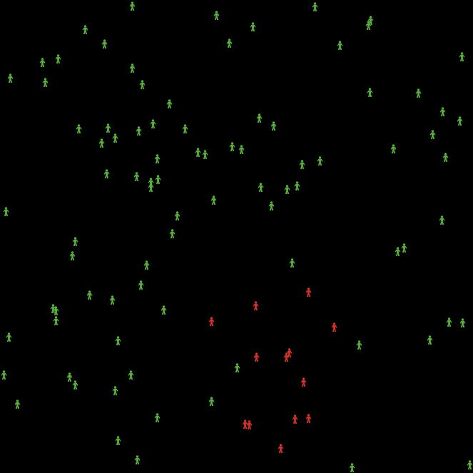 turtles-own [ zustand bewegung genesungszeit ueberlebensrate Abschottung Abschottungszeit ] to setup ca crt anzahl-turtles [ set shape "person" set zustand "gesund" set color green set bewegung TRUE set xcor -25 + random 50 set ycor -25 + random 50 ] ask n-of round (infiziert% * anzahl-turtles / 100) turtles [ set zustand "infiziert" set color red set genesungszeit Genesungszeit_ set ueberlebensrate random Überlebensrate_ ] ;;einige turtles werden infiziert und ihre Genesungszeit und Überlebensrate eingestellt ask n-of round (quarantaene% * anzahl-turtles / 100) turtles [ set bewegung FALSE ] ;;einige turtles beachten social distancing reset-ticks end to go ask turtles [ if [bewegung] of self = TRUE [ fd 1 lt random 360 rt random 360 ] ;;die sich bewegenden turtles machen einen Schritt in eine zufällige Richtung if zustand = "gesund" [ ;;if [zustand] of one-of turtles in-radius 10 = "infiziert" [ if any? turtles with [zustand = "infiziert"] in-radius 1 [ set zustand "infiziert" set color red set genesungszeit Genesungszeit_ set ueberlebensrate random Überlebensrate_ ] ] ;;turtles infizieren sich if Abschottung = TRUE [ set Abschottungszeit -1 + Abschottungszeit ] if Abschottungszeit = 1 [ set Abschottung FALSE if bewegung = "QUARANTAENE" [ set bewegung FALSE ] if bewegung = "TRUE+" [ set bewegung TRUE ] if zustand = "gesund+" [ set zustand "gesund" ] if zustand = "infiziert+" [ set zustand "infiziert" ] ] ;;die Abschottung (Quarantäne) wird "berechnet" set genesungszeit -1 + genesungszeit if genesungszeit = 0 [ set zustand "geheilt" set color pink set genesungszeit 2 ] if zustand = "gesund" [ set genesungszeit 9999999 ] if zustand = "gesund+" [ set genesungszeit 9999999 ] ;;turtles genesen (oder auch nicht) if zustand = "gesund"[ set ueberlebensrate 1 ] if zustand = "gesund+"[ set ueberlebensrate 1 ] if [ueberlebensrate] of self = 0 [ die ] if [zustand] of self = "infiziert+" [ set ueberlebensrate random Überlebensrate_ ] if [zustand] of self = "infiziert" [ set ueberlebensrate random Überlebensrate_ ] ] ;;das Sterben wird "berechnet" tick end to Abschottung_ ask n-of 10 turtles [ set Abschottung TRUE if bewegung = FALSE [ set bewegung "QUARANTAENE" ] if bewegung = TRUE [ set bewegung "TRUE+" ] set Abschottungszeit Abschottungszeit_ if zustand = "gesund" [ set zustand "gesund+" ] if zustand = "infiziert" [ set zustand "infiziert+" set genesungszeit genesungszeit ] ] ;;turtles werden abgeschottet => keine Bewegung und kein Infizieren end