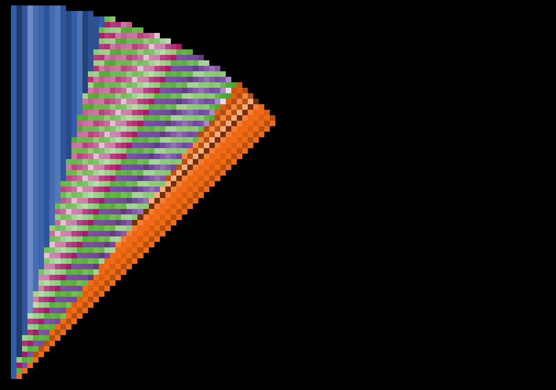 breed [lefties lefty] breed [righties righty] breed [centers center] globals[centerx centery sigma] turtles-own[nom xrel yrel moves_since_fork must_fork_left must_fork_right ] ;left path shifts x+0 and y+1 and forks to right every 4 steps ;right path shifts x+1 and y+1 and forks to left every 3 steps ;center path is 2 rows shifting x+1 and y+2 and forks to left and right every 2 steps ;the first center item is different : forks both left and right on the first step to setup clear-all resize-world 0 100 0 70 set-patch-size 10 set sigma 1 set centerx 2 set centery 1 create-lefties 1 ask lefty 0 [ set nom "L1" set xrel 0 set yrel 1 set color blue set xcor centerx + 0 set ycor centery + 1 set must_fork_left false set must_fork_right true ] create-righties 1 ask righty 1 [ set nom "R1" set xrel 1 set yrel 1 set color orange set xcor centerx + 1 set ycor centery + 1 set must_fork_left true set must_fork_right false ] create-centers 1 ask center 2 [ set nom "C1" set xrel 1 set yrel 2 set moves_since_fork 1 ;;first step is different set color green set xcor centerx + 1 set ycor centery + 2 set must_fork_left true set must_fork_right true ] create-centers 1 ask center 3 [ set nom "C2" set xrel 1 set yrel 2 set xcor centerx + 1 set ycor centery + 3 set color 125 set must_fork_left true set must_fork_right false ] create-centers 1 ask center 4 [ set nom "C3" set xrel 1 set yrel 2 set xcor centerx + 2 set ycor centery + 3 set color 115 set must_fork_left false set must_fork_right true ] reset-ticks end to go test tick end to test ;;coloriage de la case ou l'agent passe ask turtles [ let c color ask patch-at 0 0 [set pcolor c ] set moves_since_fork (moves_since_fork + 1) let newx (xcor + xrel) let newy (ycor + yrel) let r sqrt ( newx * newx + newy * newy) ;;show word "radius=" r if r < max_radius [ set xcor newx set ycor newy ;;forks if breed = lefties and moves_since_fork = 4 and must_fork_right [ ;les Left se décalent de 0 1 et fork a droite tous les 4 ;show "Forking left to right" set must_fork_right false set moves_since_fork 0 let x xcor let y ycor hatch-lefties 1 [ set xrel 0 set yrel 1 set color random-normal blue sigma set xcor x + 1 set ycor y + 0 set must_fork_left false set must_fork_right true ] ] if breed = righties and moves_since_fork = 3 and must_fork_left[ ;les Right se décalent de 1,1 et fork a gauche tous les 3 ;show "Forking right to left" set must_fork_left false set moves_since_fork 0 let x xcor let y ycor hatch-righties 1 [ set xrel 1 set yrel 1 set color random-normal orange sigma set xcor x + 0 set ycor y + 1 set must_fork_left true set must_fork_right false ] ] if breed = centers and moves_since_fork = 2 [ let cc color ;les Center se décalent de 1,2 et fork tous les 2 if must_fork_left[ ;show "Forking center to left " set must_fork_left false set moves_since_fork 0 let x xcor let y ycor hatch-centers 1 [ set xrel 1 set yrel 2 set color random-normal cc sigma set xcor x - 1 set ycor y + 0 set must_fork_left true set must_fork_right false ] ] if must_fork_right [ ;show "Forking center to right " set must_fork_right false set moves_since_fork 0 let x xcor let y ycor hatch-centers 1 [ set xrel 1 set yrel 2 set color random-normal cc sigma set xcor x + 1 set ycor y + 0 set must_fork_left false set must_fork_right true ] ] ] ] ] end