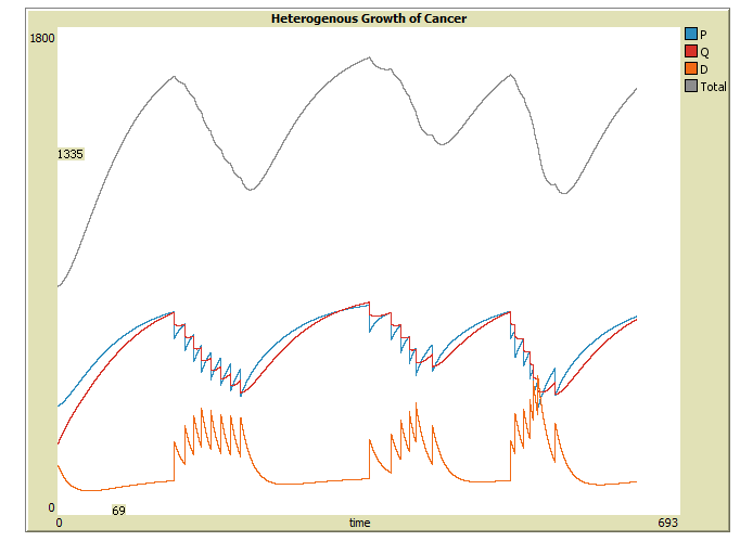 The Heterogenous cancer model assumes that the cancer is composed from 3 main types of cells: the cells that divide (proliferating cells or P-cells), the cells that don't divide (quiescent cells or Q-cells), and The cells that will die (dead cells or D-cells).