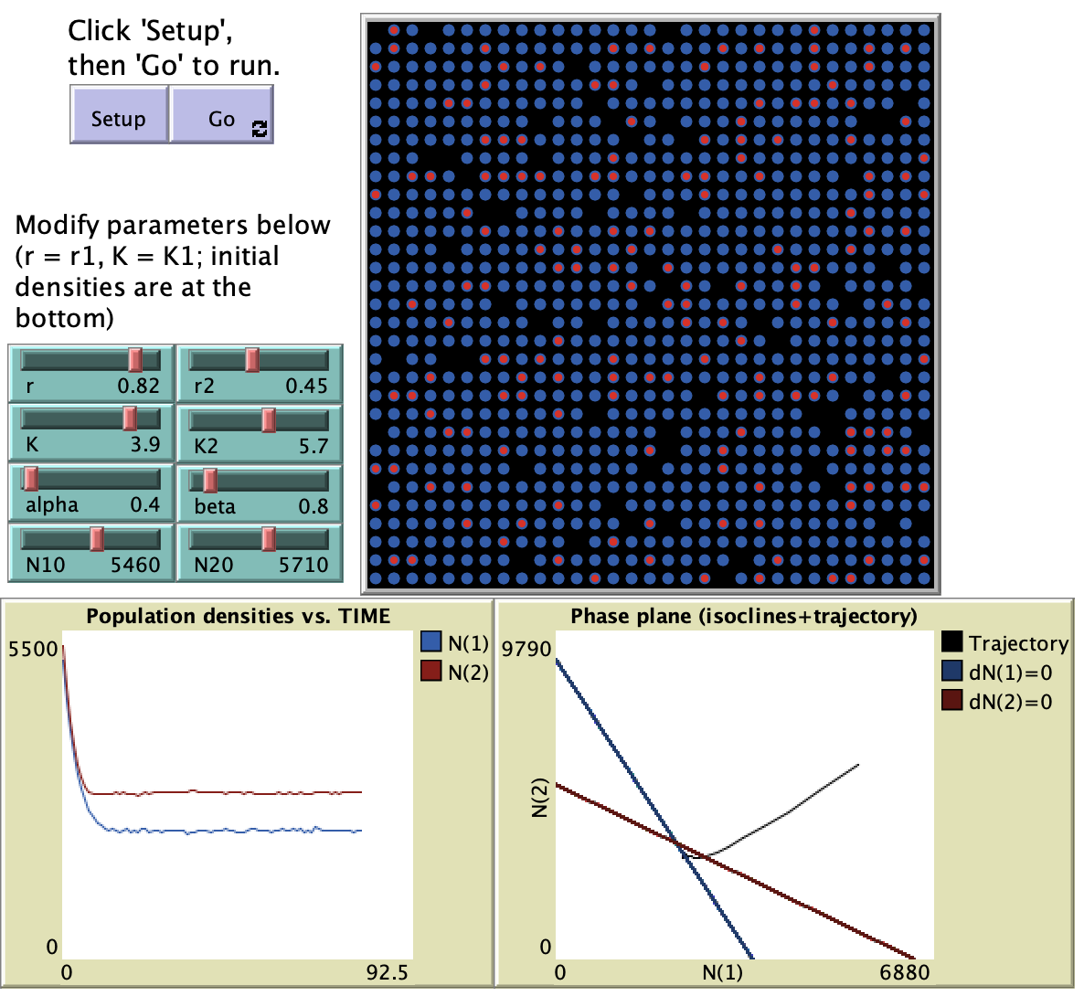 globals [open_space] patches-own [sp1_K sp2_K open?] turtles-own [sp my_K my_r] to Setup clear-all crt N10 [set sp 1 set color blue set my_K K set my_r r set shape "circle" set size (2.5 / K) move-to one-of patches] crt N20 [set sp 2 set color red set my_K K2 set my_r r2 set shape "circle" set size (2.5 / K2) move-to one-of patches] ask patches [update-patches] set open_space 1 reset-ticks end to Go reproduce ask patches [update-patches] set open_space 1 - (count turtles / (K * count patches)) ask n-of (0.05 * count patches) patches [ask turtles-here [die]] tick end to reproduce ask turtles [if random-float 1 < my_r [if any? patches with [open? = 1] [hatch 1 [migrate]]]] end to migrate carefully [move-to one-of patches with [open? = 1] update-patches] [die] ;move-to one-of patches ifelse open? = 1 [update-patches] [die] end to update-patches ;; Patch context only calculate_Ks carefully [ask one-of turtles-here [ifelse sp = 1 [if sp1_K < 0 [die]] [if sp2_K < 0 [die]]]] [] calculate_Ks ;;carefully [ask one-of turtles-here [ifelse sp = 1 [if sp1_K < 0 [die]] [if sp2_K < 0 [die]]]] [] ;calculate_Ks ;carefully [ask one-of turtles-here [ifelse sp = 1 [if sp1_K < 0 [die]] [if sp2_K < 0 [die]]]] [] ;ifelse count turtles-here > K [set open? 0 set pcolor 0 ask one-of turtles-here [die]] [set open? 1 set pcolor 9.9] end to calculate_Ks set sp1_K (K - count turtles-here with [sp = 1] - (alpha * (count turtles-here with [sp = 2]))) set sp2_K (K2 - count turtles-here with [sp = 2] - (beta * (count turtles-here with [sp = 1]))) ;ifelse sp1_K * sp2_K > 0 and ifelse sp1_K + sp2_K < 0 [set open? 0] [set open? 1] end ;to update-cells? ;; ask turtles [ifelse cell_type = 0 [set color red set color lput (opacity * 250) extract-rgb color] ; [set color blue set color lput (opacity * 250) extract-rgb color]] ; ask turtles [set size cell_size] ;end