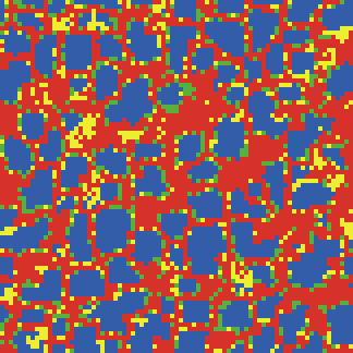 2) Setup 50% of cooperators, select the probabilistic update rule and run with 8 neighbors. Observe what happens during and after 200 generations using different combinations of the cheating advantage parameter and the stochasticity parameter. Sometimes defectors "win". Sometimes cooperators "win". And sometimes cooperators survive in clusters, while defectors survive in unconnected or connected short lines, surrounded or not by constantly changing strategy sites.
