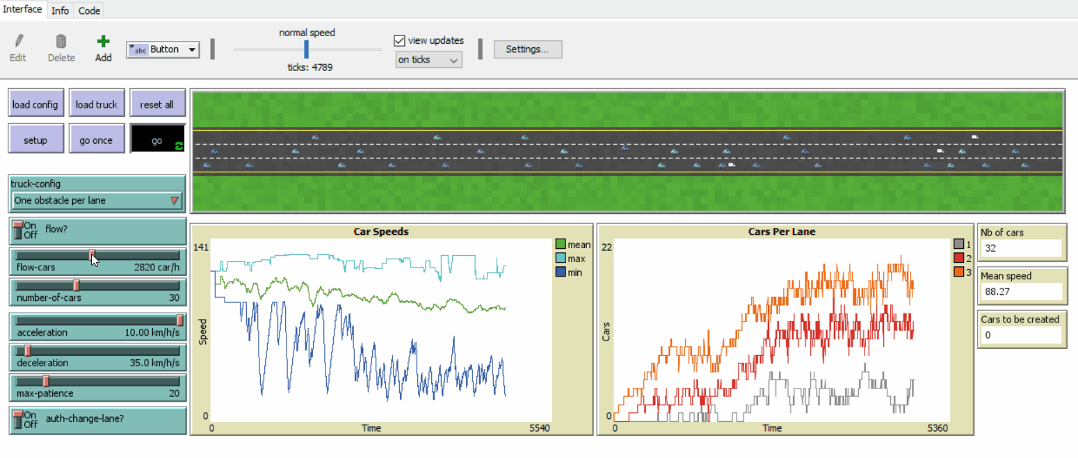 - the weblogo version is available here : https://storage.googleapis.com/netlogo/car_flow_simulation.html on the web version it is not possible to load config file and truck file. It is still possible to modify the parameters directly in the code and to add in the code more "truck" configurations.
