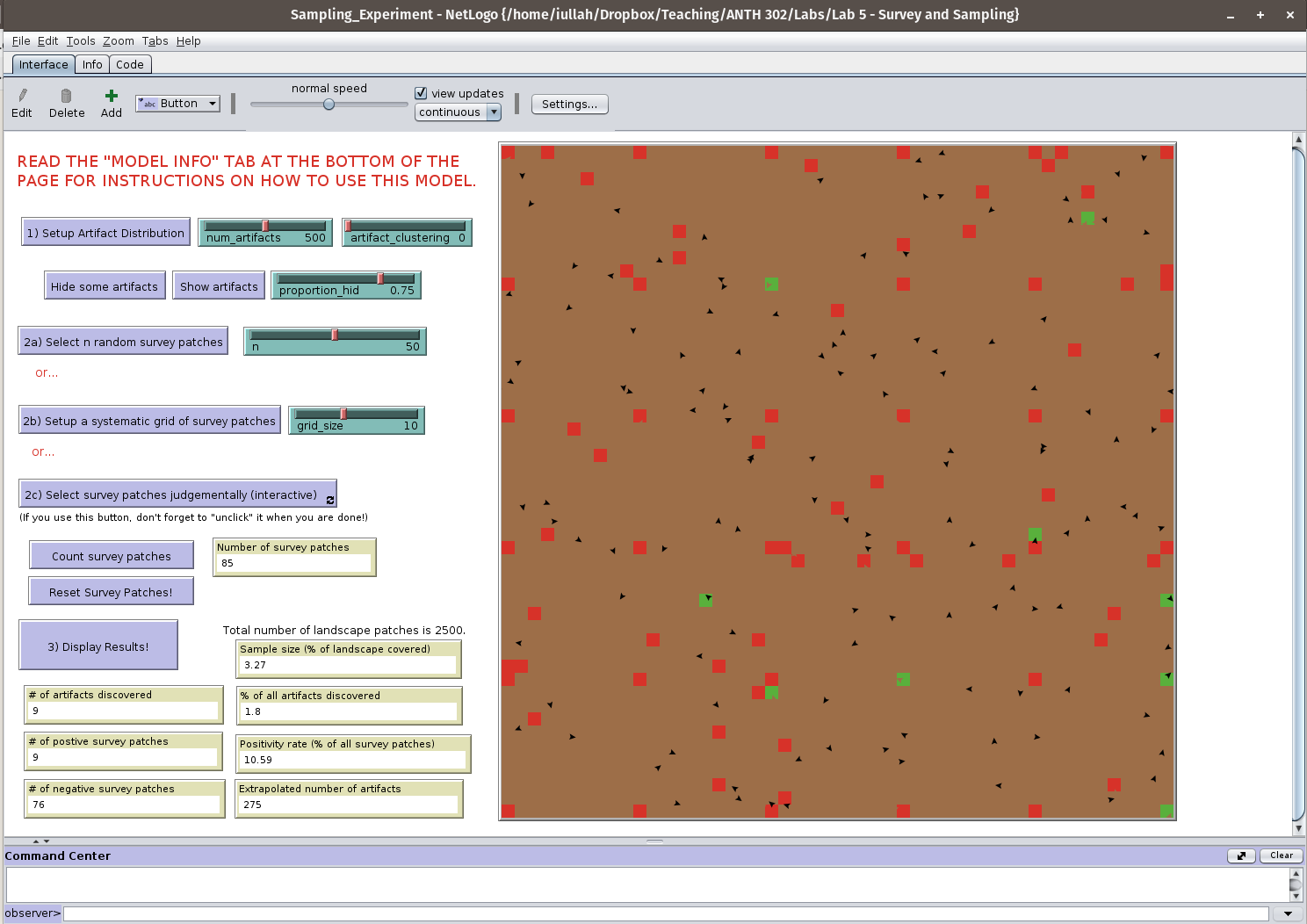 This model was created by Isaac I.T. Ullah, PhD, 2021, at San Diego State University. It is intended for educational purposes only, and comes with no warantee or guarantee of accuracy. The model derives from an analog sampling experiment lab created as part of ANTH 302 "Principles of Archaeology." It is available under the GNU public license, and is published on the web at http://isaacullah.github.io/models/Sampling_Experiment.html. Please cite the author if you use this model in any publication.