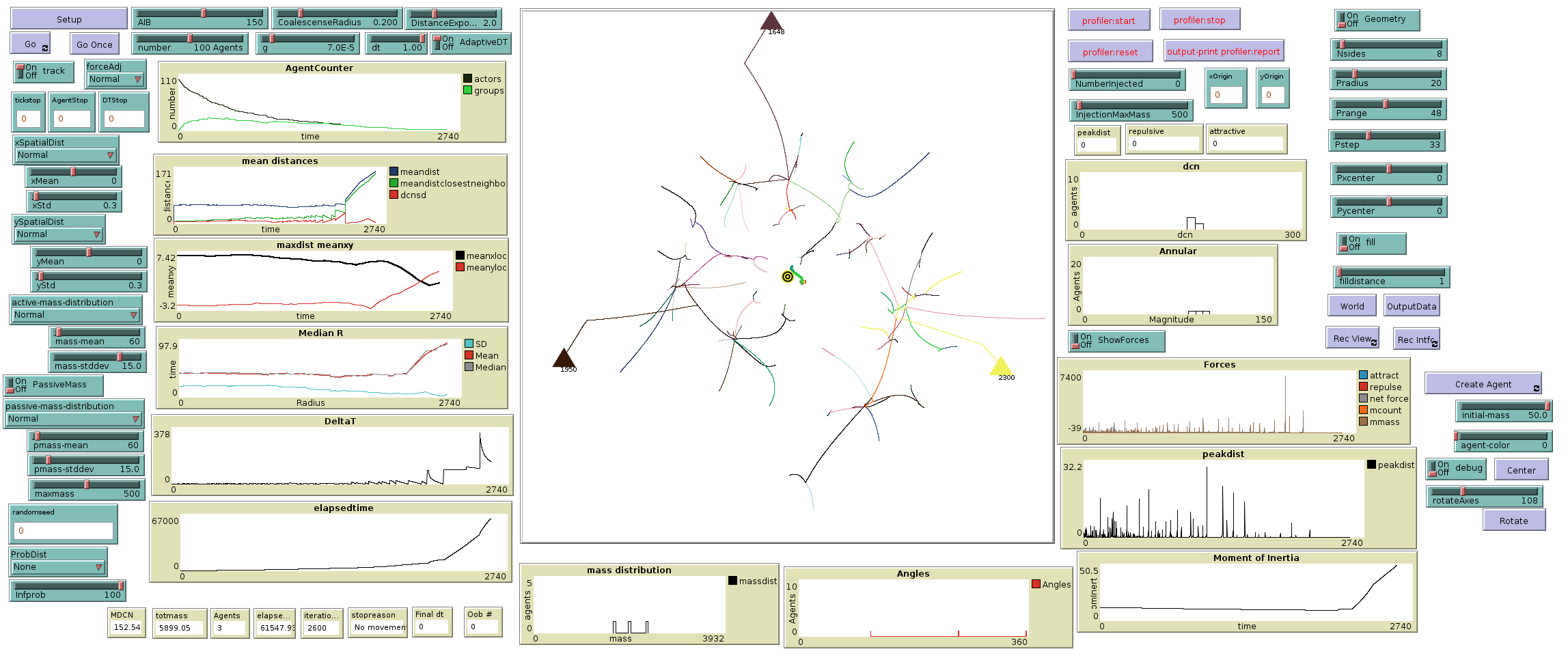 - totmass - at bottom of display, this monitor give the total mass of all agents in the simulation