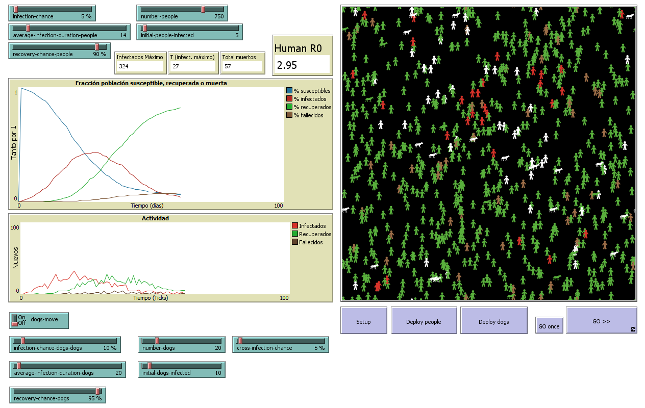 breed [ humans human] ; declaramos especie humana breed [ dogs dog ] ; declaramos especie perro globals [ ;; GLOBALES PARA PERSONAS humans-new-infected ;; número de personas infectadas en el tick humans-new-recovered ;; número de personas recuperadas en el tick humans-new-deaths ;; número de personas muertas en el tick humans-previous-infected ;; número personas infectadas en el tick anterior percentage-humans-susceptibles ;; tanto por uno población susceptible percentage-humans-infected ;; tanto por uno población infectada percentage-humans-recovered ;; tanto por uno población recuperada percentage-humans-deaths ;; tanto por uno población muerta beta ;; valor Beta en el tick gamma ;; valor Gamma en el tick i-max ;; Máximo valor de infectados t-i-max ;; Día cuando se da el máximo número de infectados total-humans-deaths ;; Total de humanos fallecidos humans-r0 ;; número de contagios provocado por cada humano infectado ] humans-own ; Propiedades de los humanos [ infected? cured? susceptible? dead? days-infected ; valor por defecto 0 infection-duration ; valor por defecto 0 humans-infection-counter ;; contador infecciones humans-recovered-counter ;; contador recuperados humans-deaths-counter ;; contador muertos ] dogs-own ; Propiedades de los perros [ infected? cured? susceptible? dead? days-infected ; valor por defecto 0 infection-duration ; valor por defecto 0 ] ;; ;; SETUP PROCEDURES ;; to setup ; Clear all clear-all reset-ticks end to deploy-people ; CREAR PERSONAS create-humans number-people - initial-people-infected ; Crear personas susceptibles iniciales (número de personas - personas infectadas) [ setxy random-xcor random-ycor set shape "person" set color white set susceptible? true set infected? false set cured? false set dead? false ] create-humans initial-people-infected ; Crear personas infectadas iniciales [ setxy random-xcor random-ycor set shape "person" set color red set susceptible? false set infected? true set cured? false set dead? false set infection-duration random-normal average-infection-duration-people 4 ; Se calcula cuánto va a durar la infección en el sujeto siguiendo una distribución normal con desviación típica = 4 if infection-duration < (average-infection-duration-people / 3 ) ; Comprobamos si la duración de la infección es inferior a la duración media entre 3 [ set infection-duration (average-infection-duration-people / 3 ) ; Si la duración es inferior a la duración media entre 3, forzamos a que la duración sea la duración media entre 3 ] ] end to deploy-dogs ; CREAR PERROS create-dogs number-dogs ; Crear perros susceptibles iniciales [ setxy random-xcor random-ycor set shape "wolf" set color white set susceptible? true set infected? false set cured? false set dead? false ] create-dogs initial-dogs-infected [ setxy random-xcor random-ycor set shape "wolf" set color red set susceptible? false set infected? true set cured? false set dead? false set infection-duration random-normal average-infection-duration-dogs 4 ; Se calcula cuánto va a durar la infección en el sujeto siguiendo una distribución normal con desviación típica = 4 if infection-duration < (average-infection-duration-dogs / 3 ) ; Comprobamos si la duración de la infección es inferior a la duración media entre 3 [ set infection-duration (average-infection-duration-dogs / 3 ) ; Si la duración es inferior a la duración media entre 3, forzamos a que la duración sea la duración media entre 3 ] ] end ;; ;; GO PROCEDURES ;; to move ; Movimiento random humanos rt random-float 360 fd 1 end to try-moving ; Chequea si los perros se mueven antes de aplicar la función de movimiento random if dogs-move [ rt random-float 360 ; Movimiento random para perros fd 1 ] end to assign-color ; Asignar color según si es infectado o recuperado if infected? [ set color red ] if cured? [ set color green ] if dead? [ set color brown] end to infect ; POSIBILIDAD DE INFECCIÓN HUMANO - HUMANO let nearby-uninfected (humans-on neighbors) ; crea variable con los humanos de los patches contiguos with [ not infected? and not cured? and not dead? ] ; no infectados, no curados, no muertos if nearby-uninfected != nobody ; chequeo de que la variable contenga a algun individuo [ ask nearby-uninfected [ if random-float 100 < infection-chance ; si el roll de 100 es inferior a la probabilidad de infectarse, se infecta [ set infected? true set susceptible? false set infection-duration random-normal average-infection-duration-people 4 ; Se calcula cuánto va a durar la infección en el sujeto ; siguiendo una distribución normal con desviación típica = 4 if infection-duration < (average-infection-duration-people / 3 ) ; Comprobamos si la duración de la infección es inferior a la duración media entre 3 [ set infection-duration (average-infection-duration-people / 3 ) ; Si la duración es inferior a la duración media entre 3, forzamos a que la duración sea la duración media entre 3 ] set humans-infection-counter (humans-infection-counter + 1) ; sumamos 1 al contador de infecciones por el nuevo infectado ] ] ] end to dogs-infect ; POSIBILIDAD DE INFECCIÓN PERRO - PERRO let nearby-uninfected (dogs-on neighbors) with [ not infected? and not cured? and not dead? ] if nearby-uninfected != nobody [ ask nearby-uninfected [ if random-float 100 < infection-chance-dogs-dogs [ set infected? true set susceptible? false set infection-duration random-normal average-infection-duration-dogs 4 ; Se calcula cuánto va a durar la infección en el sujeto siguiendo una distribución normal con desviación típica = 4 if infection-duration < (average-infection-duration-dogs / 3 ) ; Comprobamos si la duración de la infección es inferior a la duración media entre 3 [ set infection-duration (average-infection-duration-dogs / 3 ) ; Si la duración es inferior a la duración media entre 3, forzamos a que la duración sea la duración media entre 3 ] ] ] ] end to cross-infect ; POSIBILIDAD DE INFECCIÓN PERRO - HUMANO let