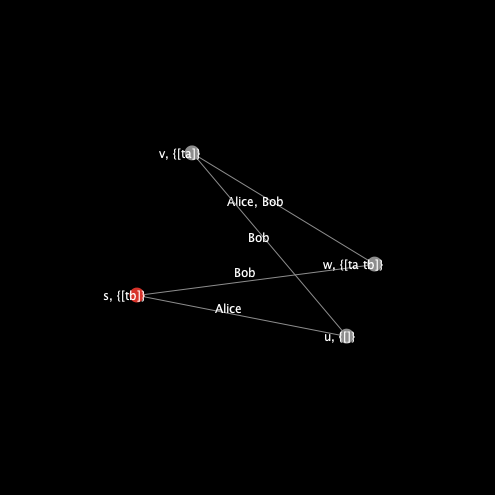 This is the structure in the viewer when setup is pressed. On the right of the viewer the first box is the epistemic predicate to evaluate (see below) and below is the world.