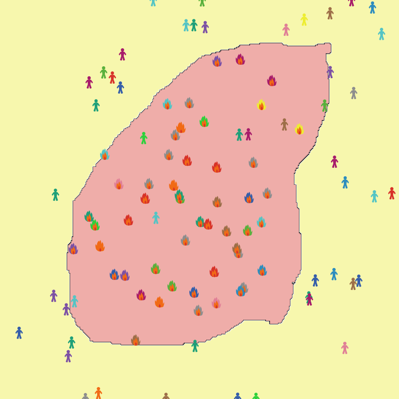 ;; Copyright Gabriele De Luca, ;; Department of e-Governance and Administration, ;; University for Continuing Education Krems, Austria, ;; gabriele.deluca@donau-uni.ac.at globals [ referendum refugees territory_color highlander-victory? ] breed [individuals individual] breed [borders border] breed [fires fire] undirected-link-breed [connections connection] individuals-own [ preference ; this is the political preference, it can assume any value. Its sign determines the vote expressed by the individual in-country? ] patches-own [ territory? ] to setup clear-all set-default-shape individuals "person" set-default-shape fires "fire" set territory_color red + 3 set highlander-victory? False make-territory repeat number-individuals [ make-individuals ] reset-ticks end ; initialise individuals to make-individuals create-individuals 1 [move-to one-of patches with [territory? = True] set size 25 set preference variance-of-preferences * 1.1 ; otherwise the simulation stops at turn 1 with 50% chances set in-country? True ] end to make-territory import-pcolors "borders.png" ask patches [set territory? False] ask patches with [pcolor = white] [set pcolor yellow + 3] ask patches with [pcolor = black] [set pcolor territory_color set territory? True] end to go if (count individuals with [in-country? = True] = 0) [ set referendum highlanders set highlander-victory? True stop] if (referendum < 0) [ set highlander-victory? True stop] if ticks > final-ticks [stop] ask individuals [move] update-preferences make-referendum repeat highlanders [kill] compute-refugees tick end to move let closest-fires fires in-radius perception-range let how_many_fires_in_range count closest-fires; assert whether there are any fires in range let fires_in_range? how_many_fires_in_range > 0 ifelse fires_in_range? [ let xsum 0 let ysum 0 ask closest-fires [set xsum (xsum + xcor) set ysum (ysum + ycor)] let xaverage (xsum / how_many_fires_in_range) let yaverage (ysum / how_many_fires_in_range) facexy xaverage yaverage left 180 forward speed * 2 ]; if True [right random 90 left random 90 forward speed] ; else let currently-on-territory? [territory?] of patch-here ifelse (currently-on-territory?) [set in-country? True] [set in-country? False] end to make-referendum ifelse (count individuals with [in-country? = True] > 0 ) ; if there are individuals in the country [set referendum mean [preference] of individuals with [in-country? = True] ] ; else, there are no individuals in the country so the highlanders decide [set referendum 0 - highlanders] end to update-preferences ask individuals [ let draw random-normal 0 variance-of-preferences let update preference + draw set preference update] end to kill let in-country-individuals individuals with [in-country? = True] if count in-country-individuals > 0 [ let murdered one-of in-country-individuals with-max [preference] ask murdered [hatch-fires 1 [] if any? other individuals in-radius perception-range [ ask other individuals in-radius perception-range [ ; RUN AWAY GOES HERE let draw random-normal 0 1 let abs-draw abs draw let update preference + abs-draw set preference update] ; I am very sorry but the order of execution for contatenated operations in this language is a mess and this is the only way I am sure that it does what I want ] die] ] end to compute-refugees set refugees count individuals with [in-country? = False] end