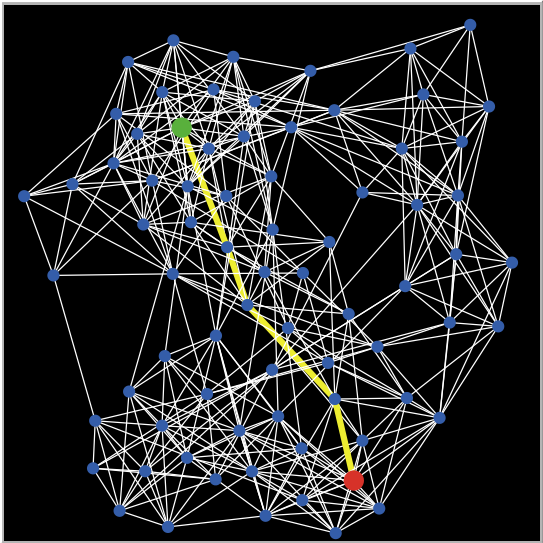 During the setup process the nodes and edges are generated. This includes the allocation of the start and finish node. The process of generating the start and finish node is random in order to prevent any human bias being introduced. Last in the setup is setting the colour of all links to white for improved visual understanding in the interface.