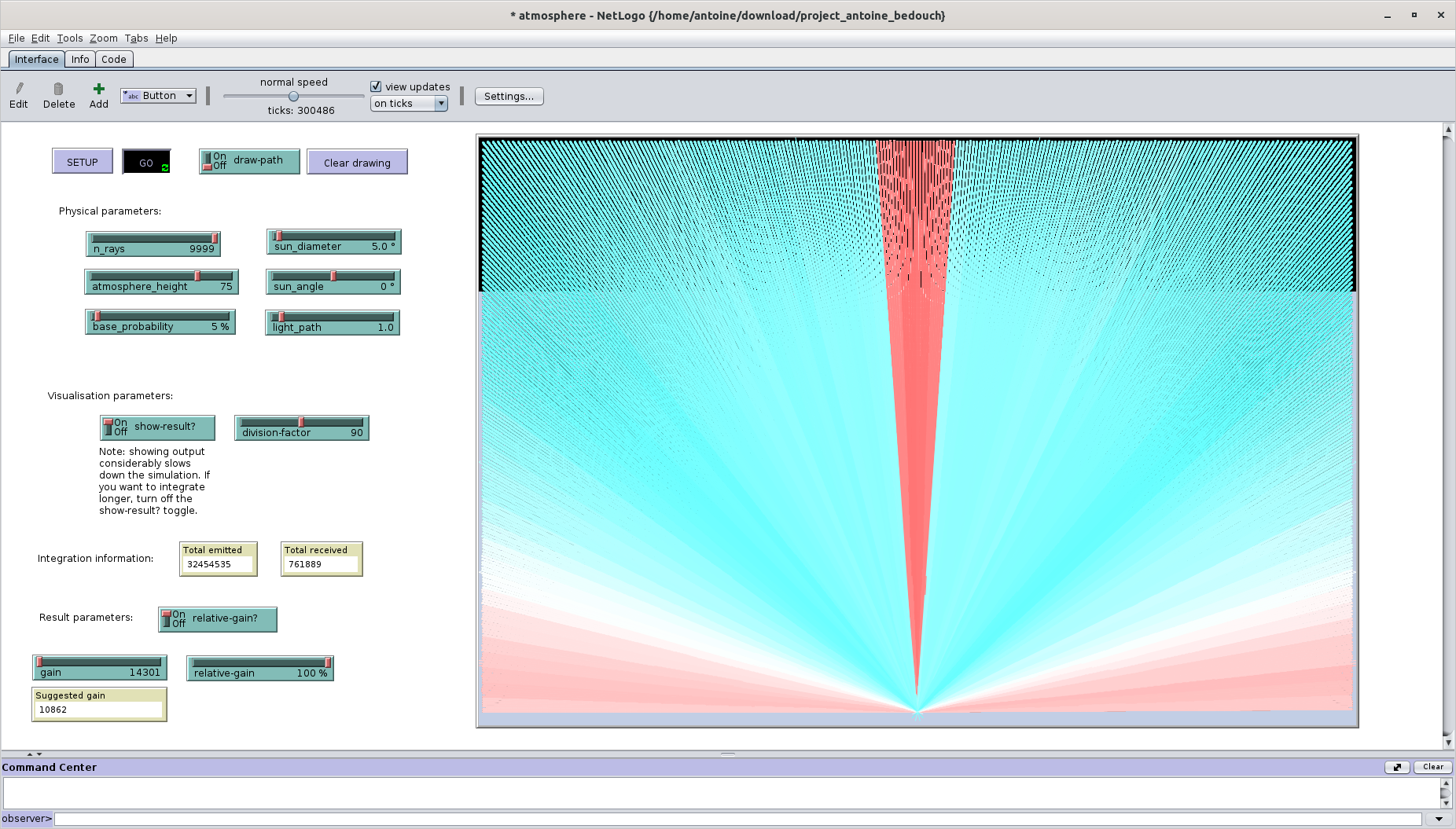 This model aims to simulate how light rays are diffused in an atmosphere and what colour the atmosphere would appear using various parameters. This model simulates a 2D atmosphere with a given height, by integrating light how many light rays of which colour arrive on the observer.