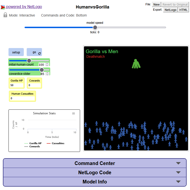 globals [ the-gorilla gorilla-hp] breed [ gorillas gorilla ] breed [ humans human ] humans-own [ coward? ] ;; New turtle variable to track cowardice to setup clear-all clear-all-plots set gorilla-hp 50 ;; Initial hit points for the gorilla ;;set initial-human-count 100 ;; Store the initial number of humans create-gorillas 1 [ setxy 0 (max-pycor - 5) set size 3 set shape "gorilla" set color green set the-gorilla self ] create-humans initial-human-count [ set xcor random-xcor let bottom-boundary (min-pycor + (world-height * 0.25)) let top-boundary min-pycor set ycor random-float (bottom-boundary - top-boundary) + top-boundary set size 1.5 set shape "person" set color blue set coward? false ;; Initially, all humans are brave (or at least not cowardly) ] reset-ticks end to go if gorilla-hp <= 0 [ ask the-gorilla [ set color red ] stop ] move-gorilla ;; Humans' behavior ask humans with [color != red] [ if coward? [ flee-from-gorilla ] if not coward? [ approach-gorilla ] ] ;; Combat check ask humans with [not coward? and color != red] [ if distance the-gorilla < 1 [ set gorilla-hp gorilla-hp - 1 trigger-cowardice set color red set coward? true ;; prevent further movement ] ] ;; Update plot set-current-plot "Simulation Stats" set-current-plot-pen "Gorilla HP" plot gorilla-hp set-current-plot-pen "Casualties" plot count humans with [color = red] set-current-plot-pen "Cowards" plot count humans with [color = grey] tick end to approach-gorilla let speed random-float 0.2 + 0.2 ;; random between 0.2 and 0.4 face the-gorilla fd speed end to flee-from-gorilla face the-gorilla rt 180 fd 0.3 end to trigger-cowardice ask humans with [not coward? and distance myself < 5] [ let dist distance myself ;;let coward-chance (0.2 - (dist / 10)) ;; closer = more likely let max-cowardice (0.1 + (cowardice-slider / 100) * 0.2) ;; maps 0–100 to 0.1–0.3 let coward-chance max (list 0 (max-cowardice - (dist / 10))) ;; never go below 0 if random-float 1 < coward-chance [ set coward? true set color gray ] ] end to move-gorilla ask the-gorilla [ ;; Occasionally jump (~5% chance) if random-float 1 < 0.05 [ jump-randomly ] ;; Otherwise, small random walk rt random 60 - 35 fd 0.3 ;; Stay within top 25% vertical range let y-limit max-pycor let lower-bound max-pycor - (world-height * 0.25) if ycor < lower-bound [ set ycor lower-bound + 1 ] if ycor > y-limit [ set ycor y-limit - 1 ] ;; Stay within horizontal bounds if xcor > max-pxcor [ set xcor max-pxcor - 1 ] if xcor < min-pxcor [ set xcor min-pxcor + 1 ] ] end to jump-randomly rt random 360 fd 0.2 ;; jump distance end to-report live-humans report count humans end to-report dead-humans report count humans with [color = red] end to-report coward-humans report count humans with [color = grey] end