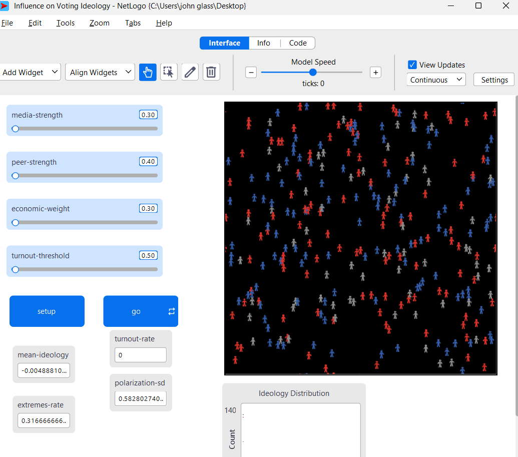 - Voter vs. non-voter contrast: Compare turtle colors with the voter-only ideology histogram to see which ideologies actually turn out.