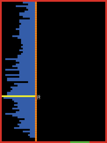 Watch the left-hand side of the playing field as the model runs. A histogram is being plotted of total points scored from each position along the kick line. The best scores (to date) for each round are highlighted in yellow (and their distance fromm the goal-line is displayed just to their right)-- the others are drawn in blue.The patch that is theoretically calculated to have the best score is shown in magenta and its distance is also displayed alongside it to the right.