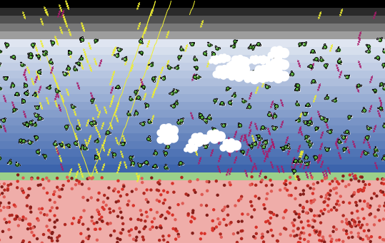If sunlight is absorbed by the earth, it turns into a red dot, representing heat energy. Each dot represents the energy of one yellow sunlight arrowhead. The red dots randomly move around the earth, and its temperature is related to the total number of red dots.