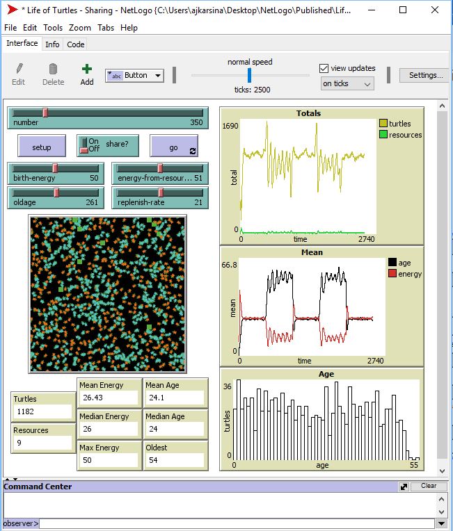 Run the simulation with the SHARING? switch set to off for awhile. Then flip the switch to on for about the same number of ticks. Then back to off. And so on. Watch the figures closely, especially the mean age and energy and the median age and energy figures.