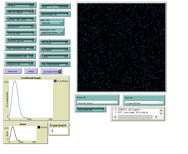 Two OUTPUT files will be generated: LAMMPSFILE and OUTPUTFILE. The names of these files can be changed in the corresponding text boxes of the interface. The first file is a DUMMP file to be read by graphical softwares such as Ovito to produce movies or snapshots. This file saves the coordinates, type(Infected, Susceptible, Recovered) and SDradius of all individuals every FREQDUMP_FILE ticks. The second output file is a .dat file containing the average infected individuals over time and the standard deviation of the average values.
