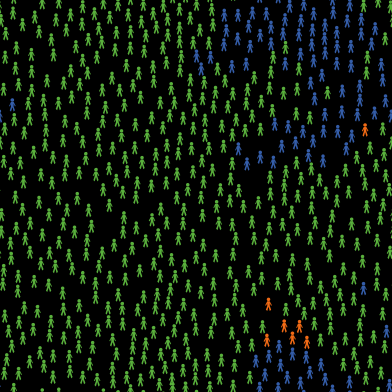 The model starts with a human population of 600 persons in which one person (orange color) is infected, and the rest of the people are susceptible (green color). The infected case passes the disease to one of the susceptible people within a radius of 1.5 at a transmission rate of 90%. The infected people are able to transmit the disease for 14 days. By the 15th day of being infected, the infected people either die (disappear from the model) at mortality of 20% or recover and become immune (blue color).