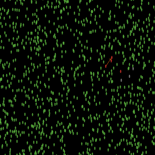 undirected-link-breed [ sdist-links sdist-link ] ;; social distance link undirected-link-breed [ halo-links halo-link ] ;; halo link directed-link-breed [ infect-links infect-link ] ;; infection link breed [ peoples people ] breed [ circles circle ] breed [ halos halo ] peoples-own [ infected? ;; if infected? tested? ;; if tested for corona sick? ;; if sick. known? ;; knows if has corona virus: true = tested positive, sick sicktime ;; how long, in weeks, the turtle has been infectious recovered? ;; if recovered dead? ;; if dead age ;; how many weeks old the turtle is ] globals [ infection-radius2 cumulative ] links-own [ ] ;; The setup is divided into four procedures to setup clear-all ; ifelse fix-seed? [random-seed 30281][random-seed new-seed] set infection-radius2 3 ;infection-radius + 2 setup-people update-colors reset-ticks end to setup-people create-peoples number-people [ setxy random-xcor random-ycor ;random-xcor * 0.9 random-ycor * 0.9 set color green set shape "person" set size 1 set infected? false set sick? false set recovered? false ] end to setup-network ask peoples [ create-sdist-links-with other peoples in-radius infection-radius2 [ set hidden? true ] ] end to go move infect update-colors update-global if ticks = 300 [ stop ] if allow-social-distance? [ flex ] tick end to flex ask sdist-links with [link-length > infection-radius2] [die] ask peoples with [color = red] [ create-sdist-links-with other peoples in-radius infection-radius2 [ set hidden? true ] let temp peoples in-radius infection-radius2 if count temp > 1 [layout-spring temp sdist-links 0.2 (infection-radius2 + 2) 0.2] ] end to move ask peoples [ rt random 30 lt random 30 fd 0.1 ] end to infect ; if ticks = 50 [ ; ask one-of turtles with [infected? = false and recovered? = false] ; [ ; set infected? true ; ] ; ] ask infect-links [ die ] ask peoples with [ infected? = true] [ set sicktime sicktime + 1 if sicktime >= (14) [ set recovered? true set infected? false ask halos-here [ die ] ] let whome who ask other peoples with [infected? = false and recovered? = false] in-radius infection-radius2 [ if random 100 < 5 [ create-infect-link-from myself [ set color orange ] set infected? true ] ] ] end to update-colors ask peoples [ if infected? = true [set color red] if recovered? = true [set color gray] ] end to update-global set cumulative max list cumulative (count peoples with [infected? = true]) end