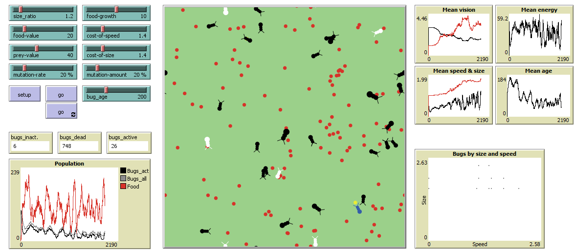 A model of natural/artificial selection with bugs who compete for food. By controlling different aspects of the environment and gene mutation one can observe how the population of bugs adapt and the selection of genes differ.