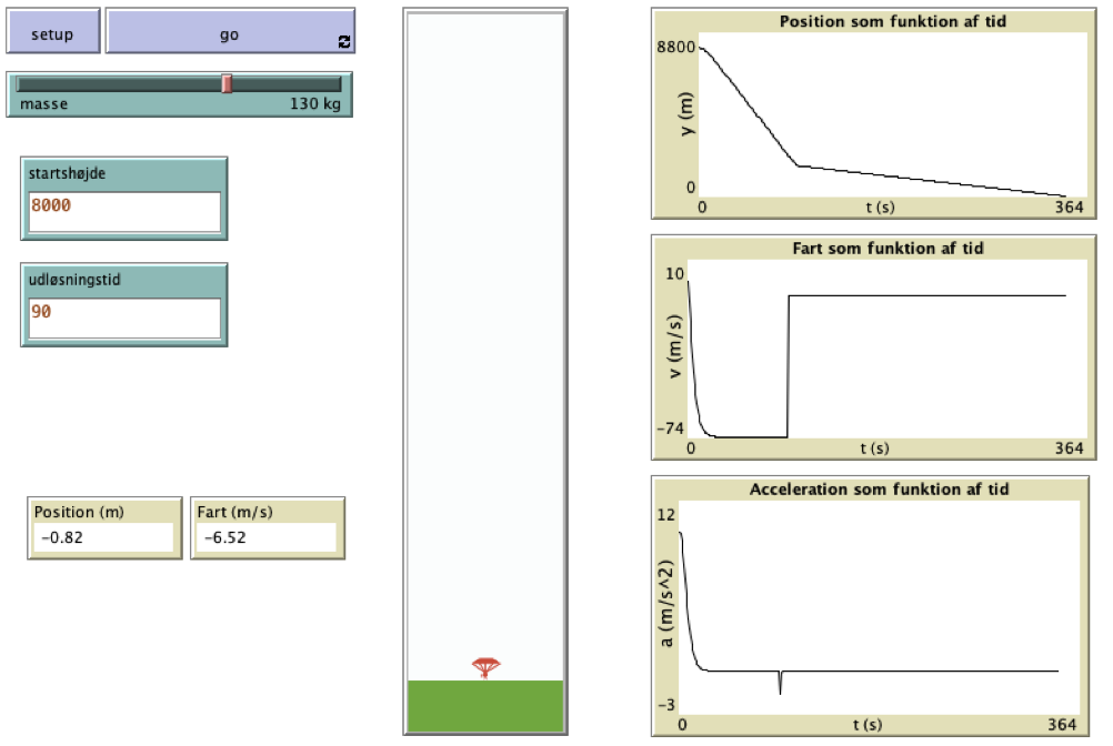 globals [ Fluft acceleration tyngde-acceleration NLoop A dt y vy ] breed [men man] to setup clear-all set tyngde-acceleration 9.82 ;Alle fysiske størrelse er i SI-enheder set acceleration tyngde-acceleration set NLoop 100 set A 1.3 * 0.3 set dt 1.0 / NLoop set y startshøjde set vy 0 create-men 1 [ setxy 0 y ; start position set shape "person" set color red set size 8 ] reset-ticks paint-sky end ; beregn ny position og fart to go if (ticks > udløsningstid ) [ set A 10 * 5 ask men [ set shape "parachute" set size 15 set heading 0 ] ] repeat Nloop [ ; beregningerne laves med et kortere tidsinterval end skærmen opdateres set Fluft 0.5 * 1.2 * A * vy * vy ; Fluft = 0.5 · rho · A · cw · v^2 set acceleration (tyngde-acceleration - Fluft / masse) set vy ( vy - acceleration * dt ) set y ( y + vy * dt ) ] if (y < 0 ) ; stop inden manden rammer jorden [ ask patches with [ pycor < 0 ] [ set pcolor green ] print ticks stop ] ask men [setxy xcor ( y ) ] ; hvis ikke jorden er ramt endnu flyttes manden paint-sky tick ; ticks tæller antal sekunder end to paint-sky ask patches [ set pcolor 100 - ( min list ( y / 1000) 10 )] end