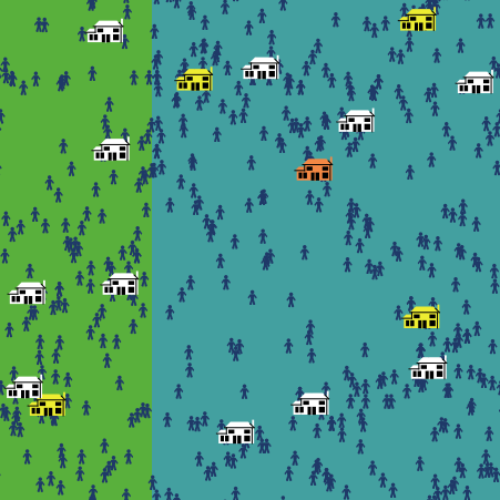 breed [persons person] breed [universities university] persons-own [target familyincome enrolled?] universities-own [highreputation? reputation enrolledstudents] ; reset button to setup clear-all setup-patch setup-university setup-person reset-ticks end ; setup the patch colors to city and urban areas to setup-patch ask patches with [pxcor < -6 AND pycor >= -16] [ set pcolor green ] ask patches with [pxcor >= -6 AND pycor <= 16] [ set pcolor cyan - 1 ] end ; set up the universities based on reputation - it has different colors based on reputation to setup-university create-universities number-of-universities [fd max-pxcor setxy random-xcor random-ycor] ; set the universities shape and default color ask universities [ set shape "house two story" set size 2.6 set color white ; high reputation with white color, moderate reputation with yellow and low reputation with orange ; reputation is based on rank of 30 university - low rank means high reputation and vice versa set reputation random 100 * university-rank / 100 if (reputation >= 0 and reputation < 10 ) [set highreputation? true] ifelse (reputation >= 10 and reputation < 19) [set highreputation? true set color yellow][ ifelse (reputation >= 19) [set highreputation? false set color orange + 1 ][set highreputation? true]] set enrolledstudents 0] end ; setup students color and shape and the target to setup-person create-persons number-of-students [setxy random-xcor random-ycor set shape "person" set size 1 set familyincome one-of (range 500 6000) set color blue - 2 set target 1 set target one-of universities face target ] reset-ticks end ; movement of students between universities to select their target based on distance as well to move-students ask persons [ if distance target = 0 [ set target one-of universities face target ] ifelse distance target < 1 [ move-to target ] [ fd 1 ] ] end ; pick the target university based on family income, rank and distance, the university will be selected. to select-university ifelse (familyincome > income-level and color = white ) [ set target one-of universities with [[familyincome] of myself] with-max [reputation] ] [ ifelse (familyincome < income-level and color = yellow) [ set target min-one-of universities with [[familyincome] of myself - (distance myself) / 100 > 0] with-max [reputation] [distance myself]] [ifelse (familyincome < income-level and color = brown) [set target min-one-of universities with [[familyincome] of myself - (distance myself) / 100 > 0] with-min [reputation] [distance myself]] [set target min-one-of universities with [[familyincome] of myself - (distance myself) / 100 > 0] [distance myself] ] ]] if target != nobody [ move-students] set enrolled? TRUE end ; run the model by calling select university and move students to target to go ask persons [ select-university move-students] ask universities [ calculate-enrolledstudents ] tick if (ticks = 50) [stop] end ; proc to calculate the count of enrolled students to calculate-enrolledstudents if (enrolledstudents < number-of-students) [set enrolledstudents enrolledstudents + 1] end