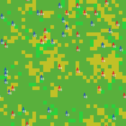 Each time step (tick) agents first process the cell they are on, and then move to one of the eight neighboring cells. The movement may be random, or the agent may be more intelligent about seeking resources (if the PEOPLE-SEEK-RESOURCES? switch is turned on).