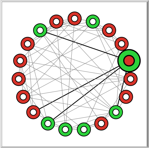 Algorithm can be also observed in the step-by-step section by clicking one by one the following buttons: 0) "setup"- to set all values of parameters. Note that this time only public opinion of agents are visible in order to present, what agents really know about each other. Herein some agents may initially be in dissonance to ease observation of possible scenarios 1) "target" - an agent, which opinion will be updated is selected. Thick black lines indicate the target's neighbors. Now target's private opinion is shown 2) "q-panel" - q agents among all target's neighbors are randomly selected, they are marked by increased size 3) "act" - target updates its public opinion according to the ALGORITHM described in Section HOW IT WORKS 4) "think" - target updates its private opinion according to the ALGORITHM described in Section HOW IT WORKS The monitor displays which behavior worked - conformity (compliance/disinhibitory contagion) or independence. (In order to ensure, that you observe conformity set p=0, to guarantee independence set p=1.)
